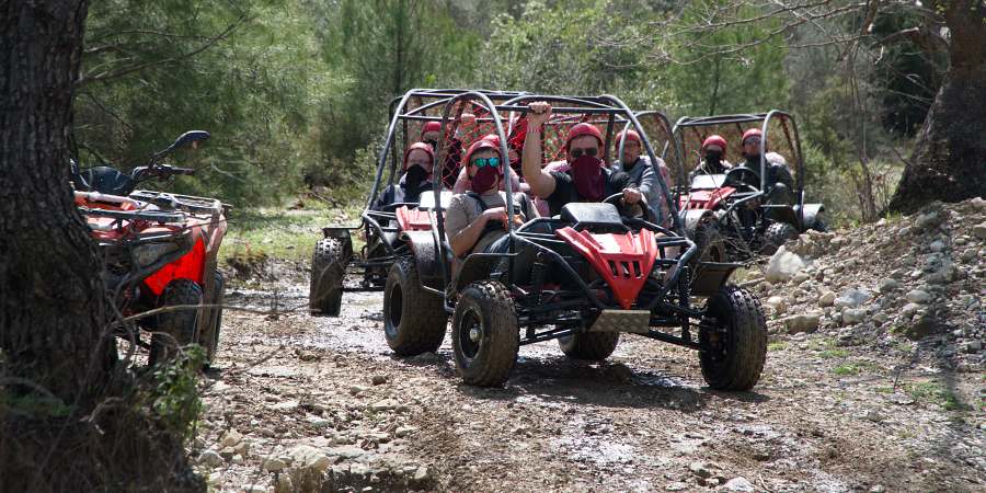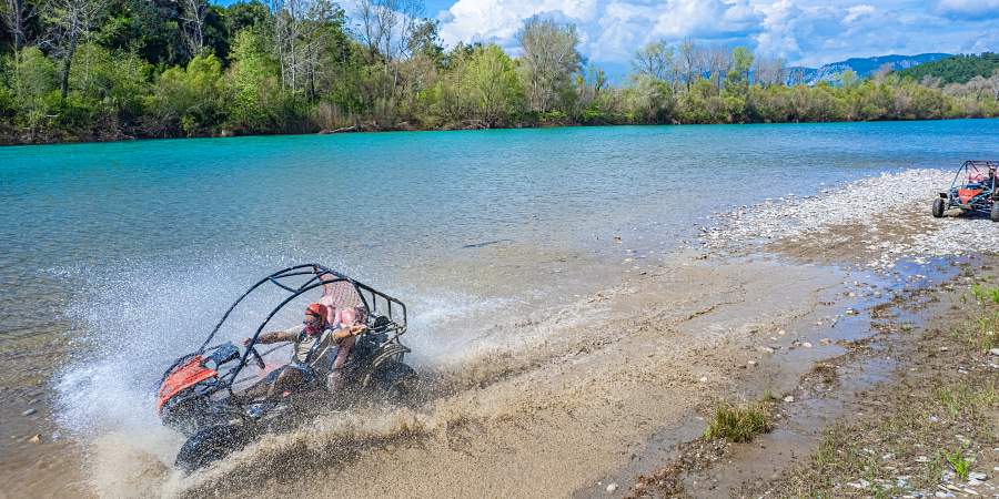 We pick you up from your hotel in comfortable, air-conditioned vehicles and take you to our specially prepared off-road safari area. The buggy safari route includes dusty trails, muddy tracks, small hills, and shallow river crossings, all set within the natural surroundings of Side. Before the tour begins, our professional instructors provide a full briefing about how to use the buggy, safety rules, and details of the route.